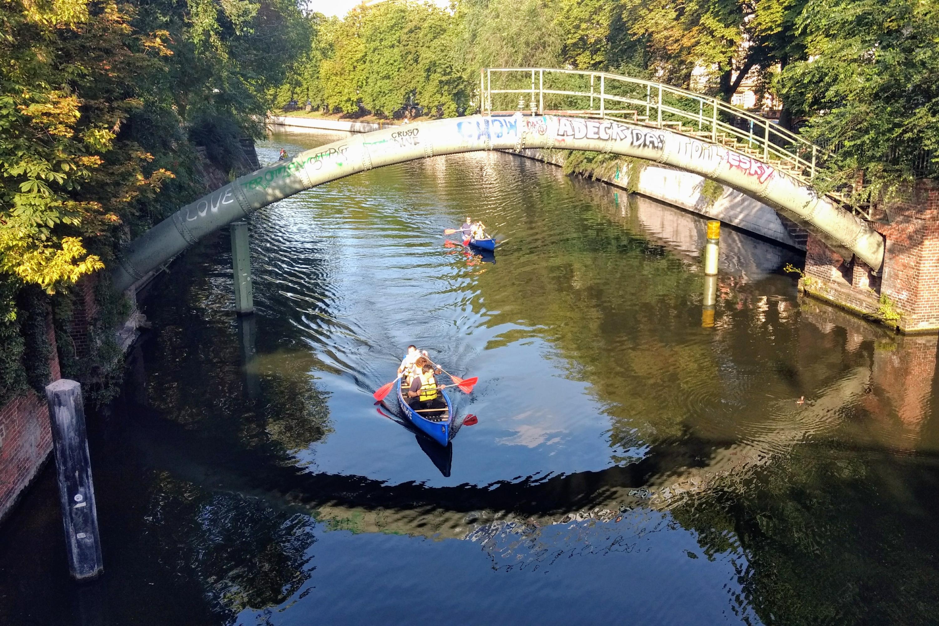… schließt sich unserer Tour durch das Herz von Kreuzberg an. Der Kanutrail über den Landwehrkanal bis hin zu einem landschaftlich besonders schönen Abschnitt der Spree hat jede Menge Highlights zu bieten. Von den Wiesen am Dreiländereck, entlang des Görlitzer Ufers bis hin zur Oberschleuse an der Schlesischen Brücke spürst du auf dieser Tour, wie sich das weltoffene, tolerante, multikulturelle Berlin anfühlt. Natürlich gibt es auch auf dieser Tour viel Wissenswertes zur Berliner Geschichte, und unsere Guides halten amüsante Anekdoten über den wohl buntesten Stadtteil Berlins bereit. Bei einem Abstecher zur Spree paddeln wir an bekannten Sehenswürdigkeiten wie der Oberbaumbrücke, dem Molecule Man sowie dem Badeschiff vorbei. Am Osthafen sehen wir die bis heute erhaltenen Überreste der ehemaligen Grenzkontrollanlage aus Zeiten der Teilung zwischen Ost- und Westdeutschland. Bevor es wieder zurück zum Landwehrkanal geht, kommen wir der Oerbaumbrücke zum greifen nah.