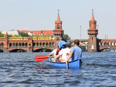 Bei einem Abstecher zur Spree paddeln wir an bekannten Sehenswürdigkeiten wie dem Molecule Man, der Oberbaumbrücke und dem Spreespeicher vorbei. Am Osthafen sehen wir die bis heute erhaltenen Überreste der ehemaligen Grenzkontrollanlage aus Zeiten der Teilung zwischen Ost – und Westberlin. Bevor es wieder auf den Landwehrkanal geht, kommen wir der Oberbaumbrücke zum Greifen nah.
